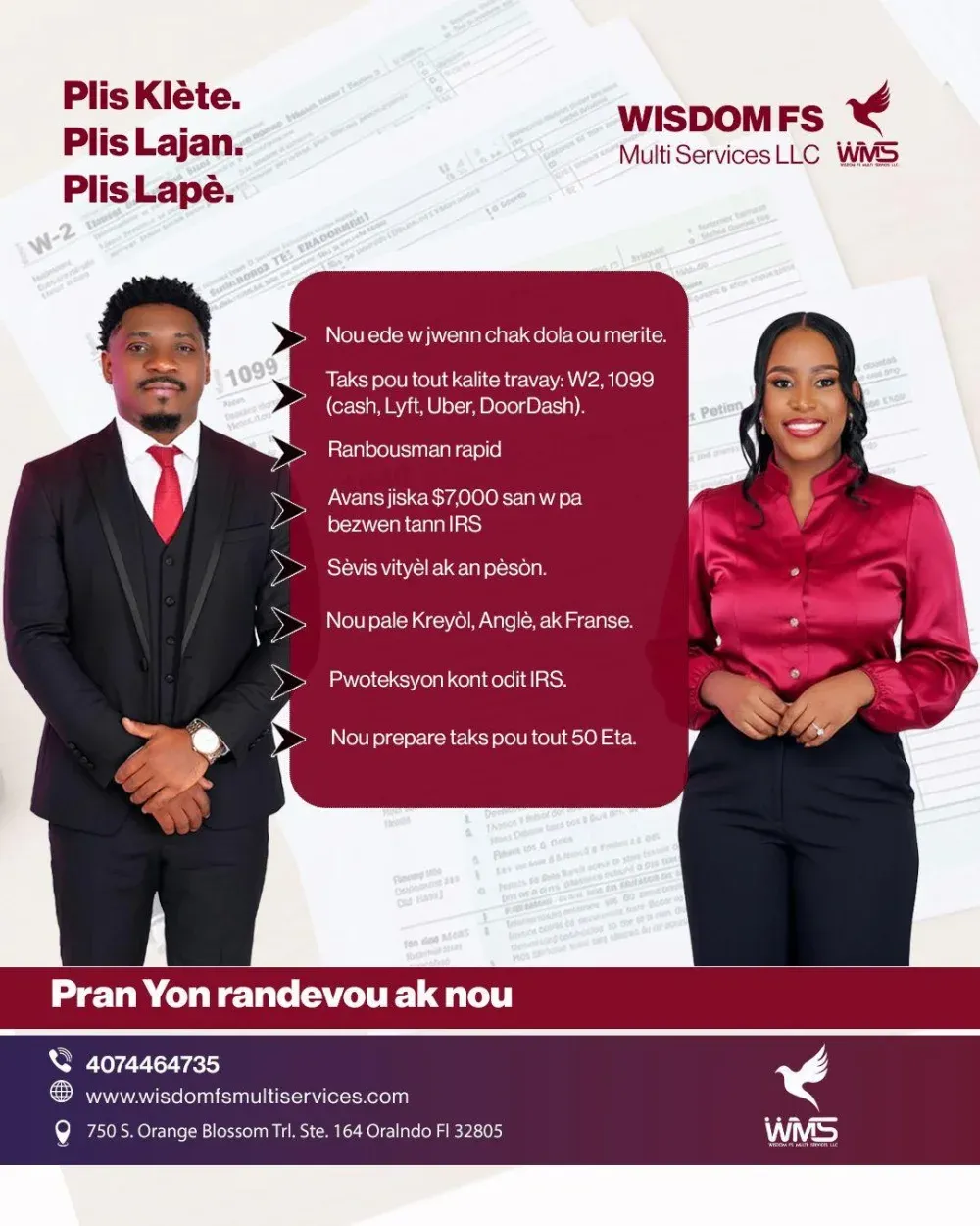 Thank you for choosing Wisdom FS Multservices LLC for your tax filing needs! We’re excited to serve you. Please complete the intake form as thoroughly as possible. If you have any questions or need assistance, feel free to call us at +1 407-446-4735.